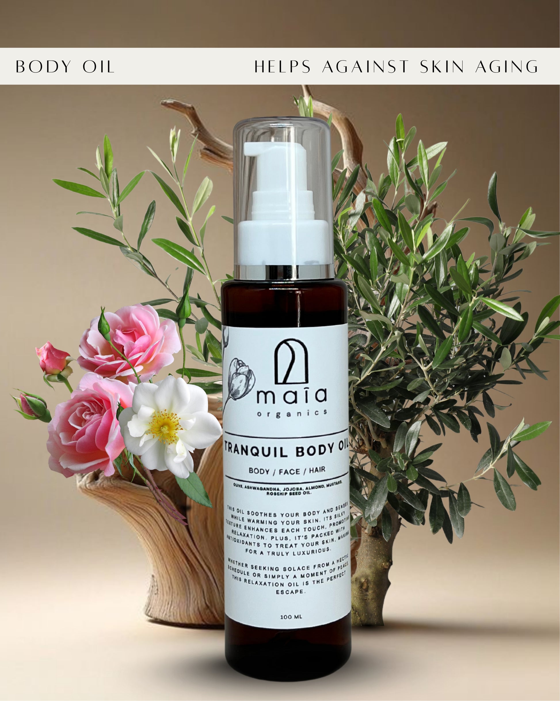 Ingredients: Olive, Ashwagandha, Jojoba, Almond, Mustard and Rosehip seeds body oils.